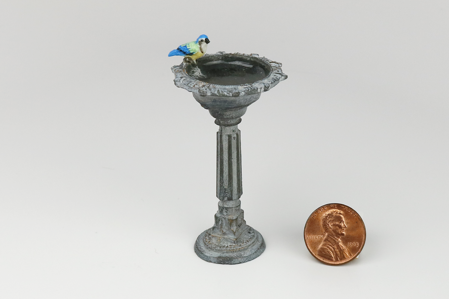 A lovely resin bird bath with reflective "water" and a beautiful blue bird perching finished in a slightly distressed grey color.
