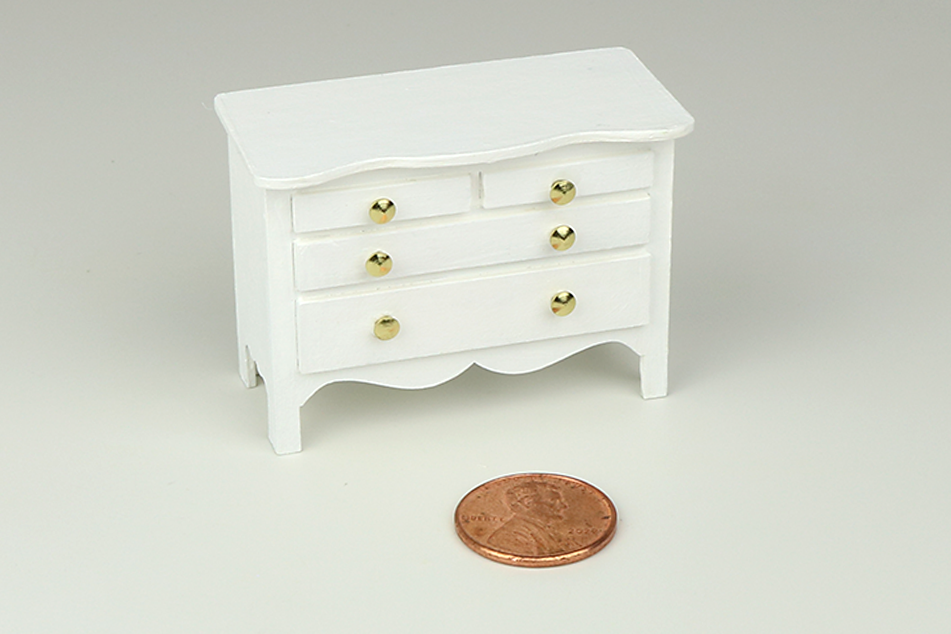 An assembled version of our half scale dresser kit, painted white and finished with brass handles.