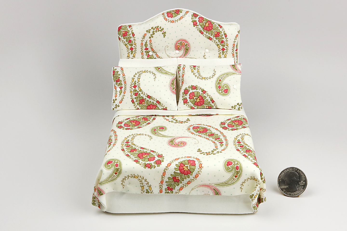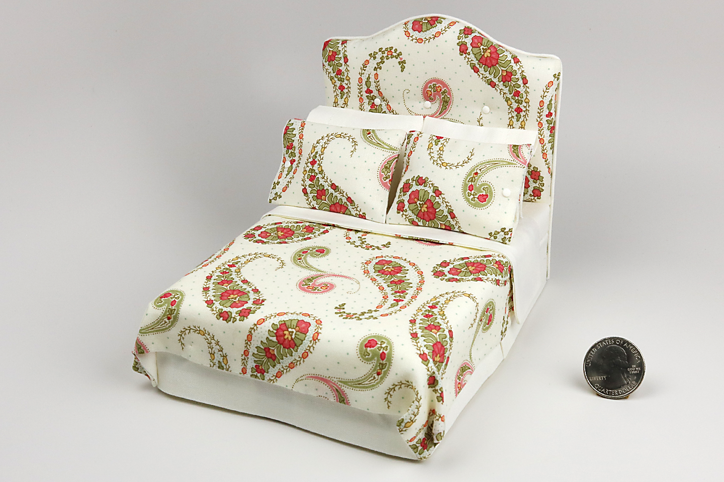 This detailed miniature bed features a cute bedspread, a real tufted headboard with tiny buttons, and matching pillows!