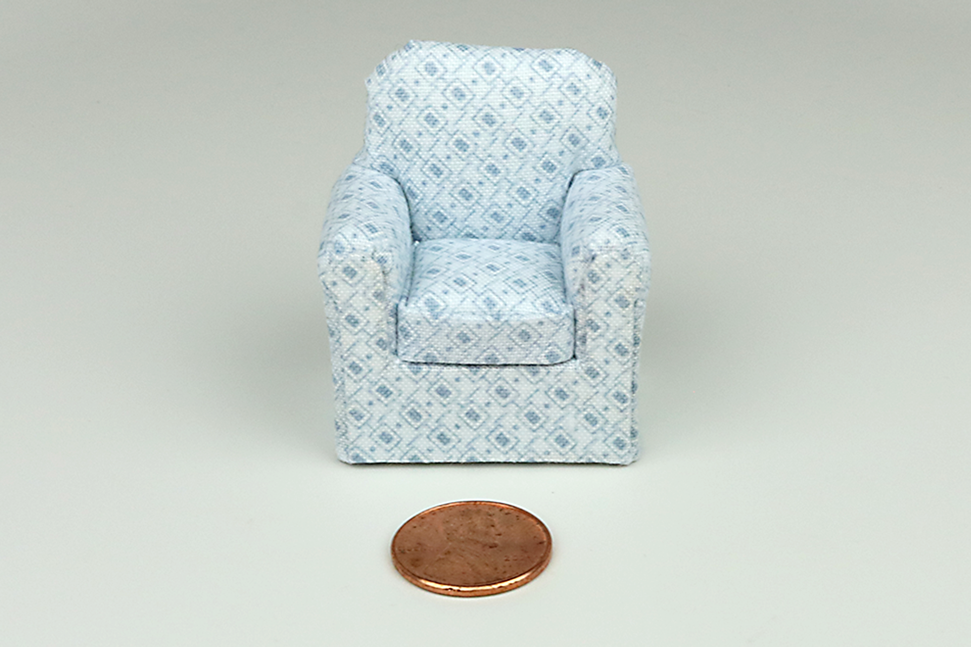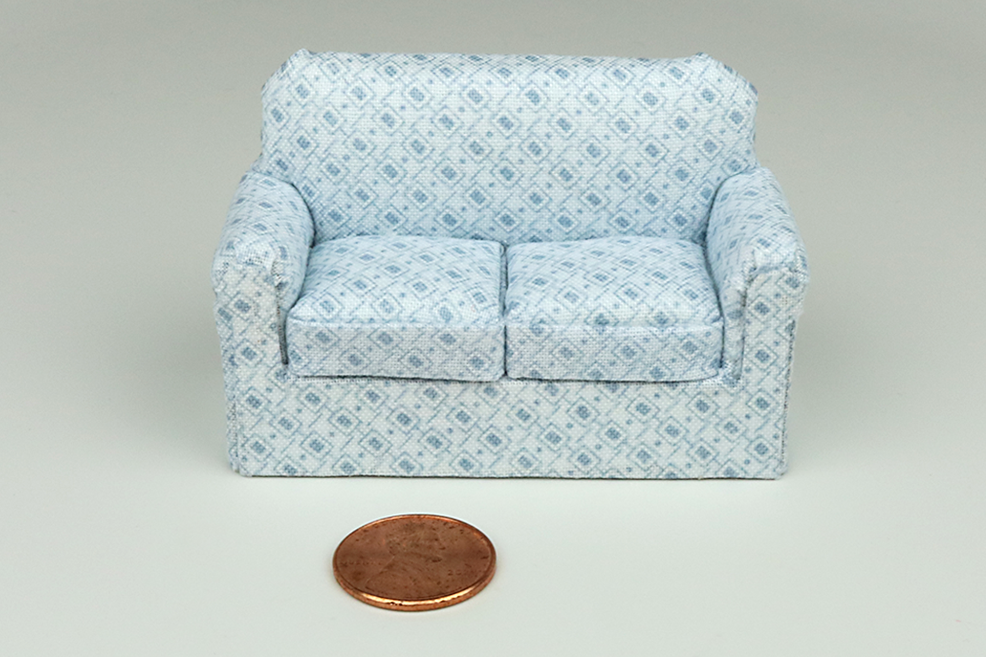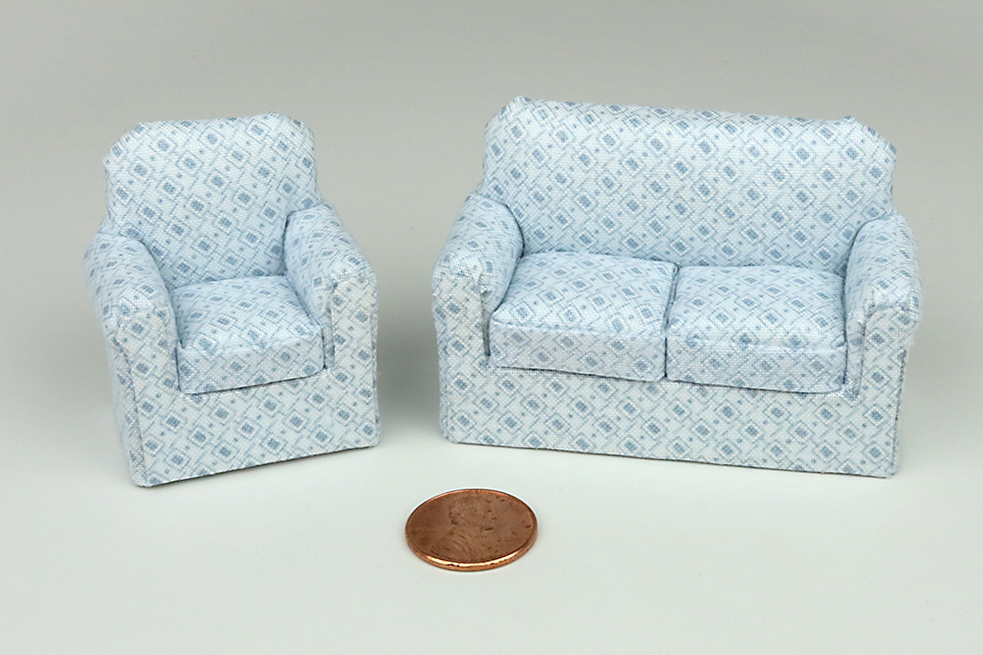 Our half-scale sofas and armchairs are hand made by us in fashionable patterns and fabrics that we have thoughtfully selected to be appropriately sized for 1:24 scaled dollhouses and projects.