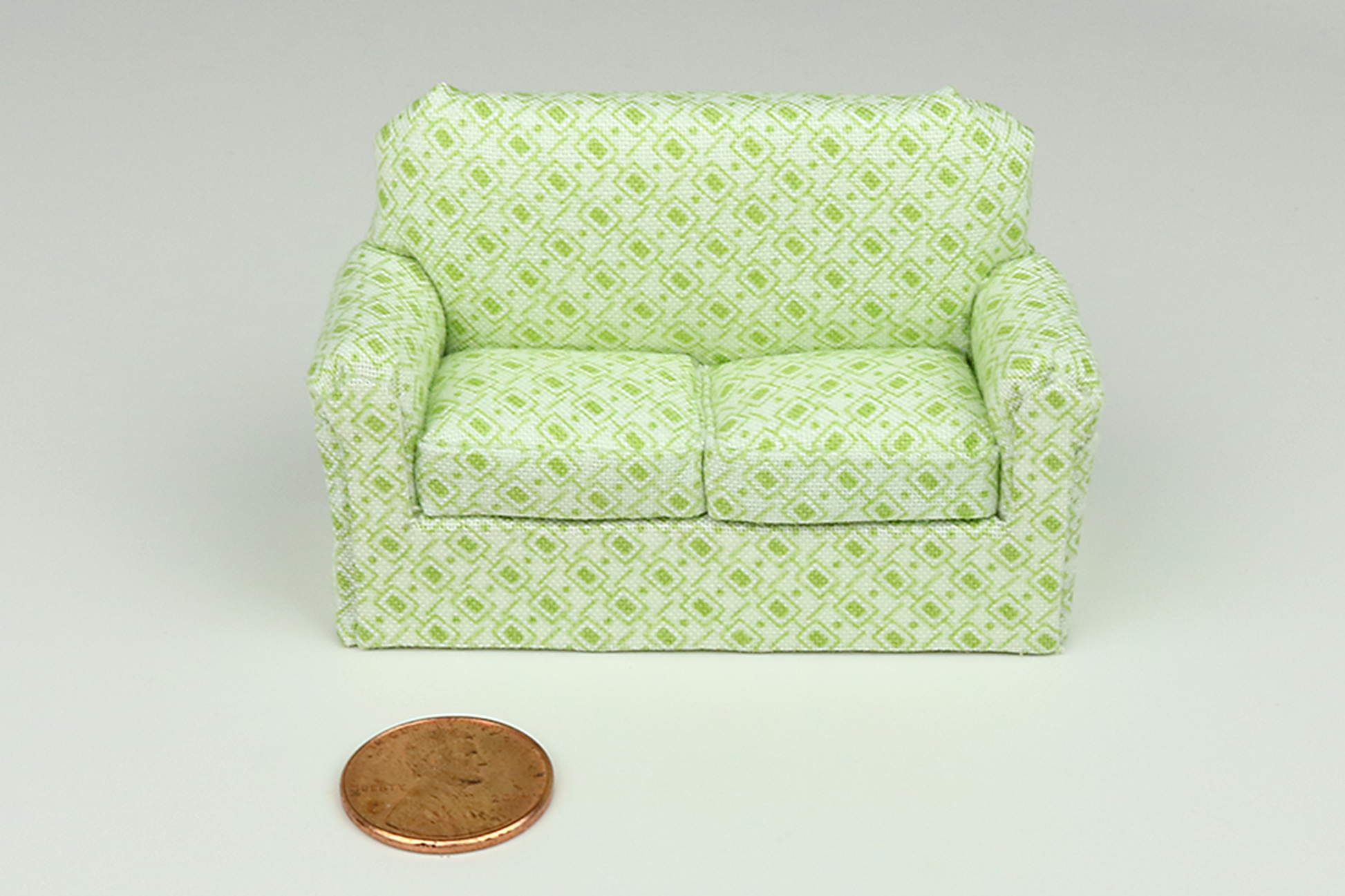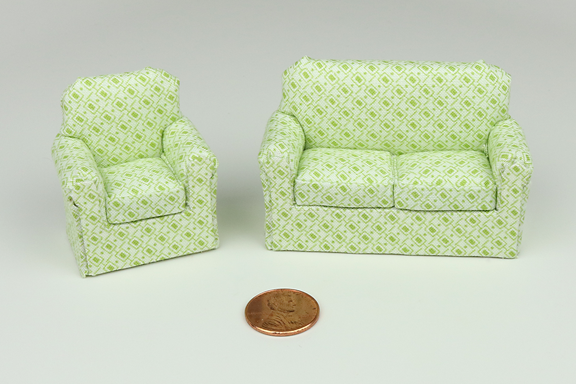 Our half-scale sofas and armchairs are hand made by us in fashionable patterns and fabrics that we have thoughtfully selected to be appropriately sized for 1:24 scaled dollhouses and projects.