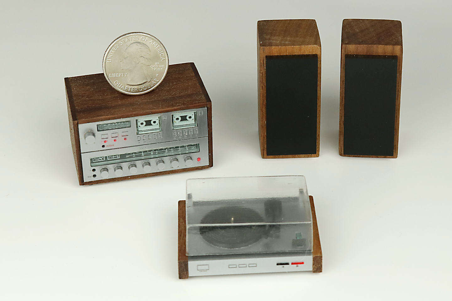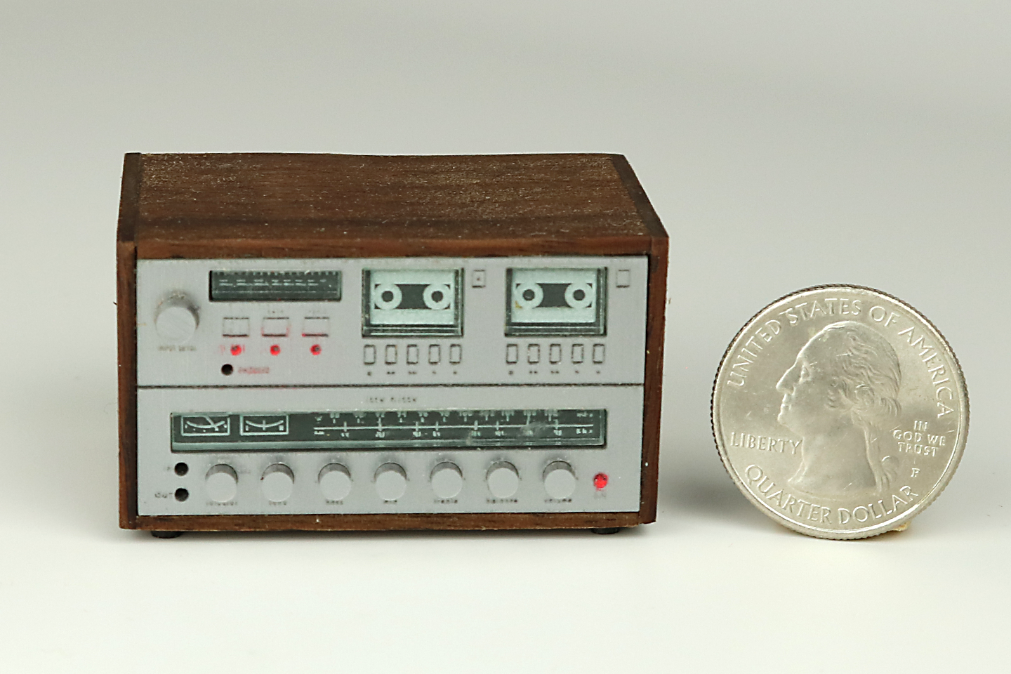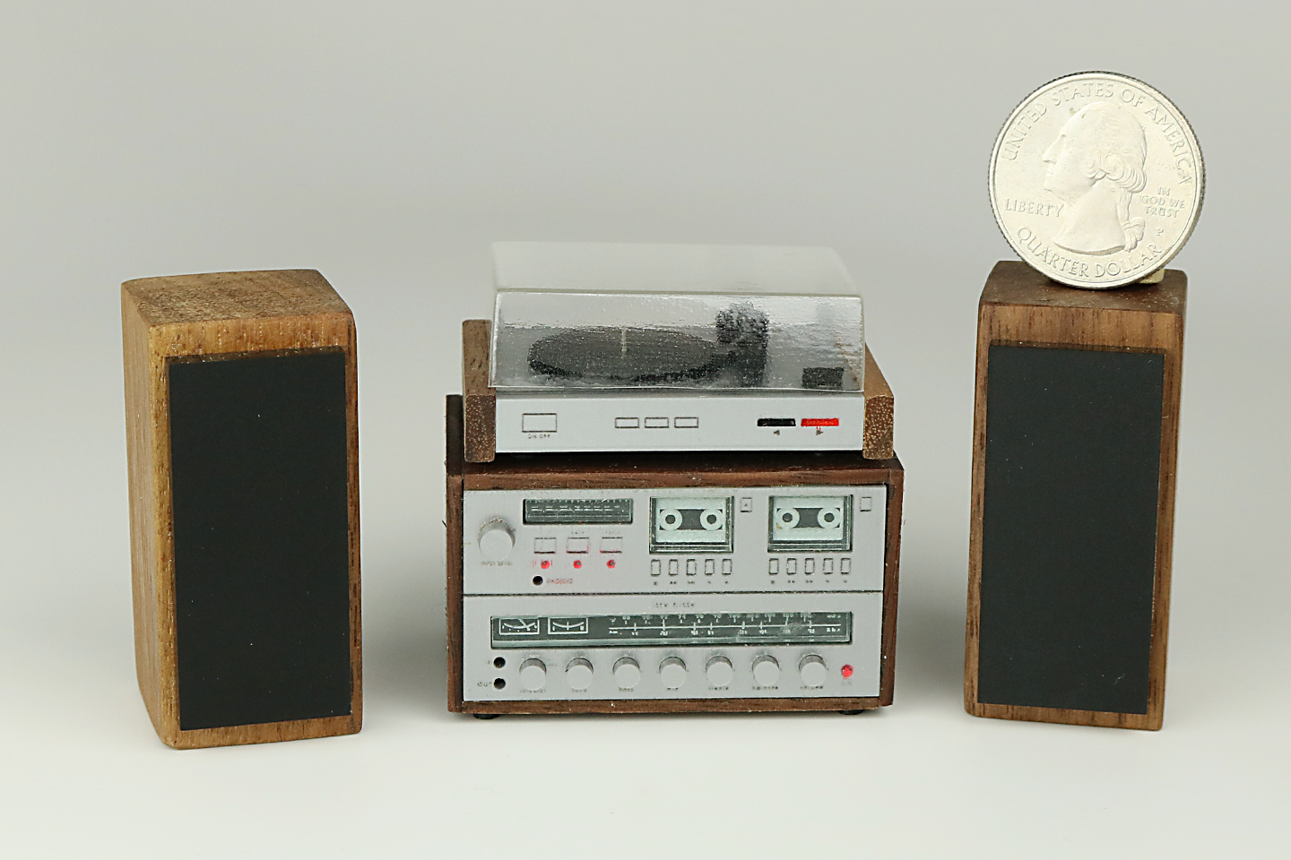 Turn it up and tune into your favorite 1980s jams with a vintage mini stereo stack made out of solid walnut. Comes with four pieces including two speakers, turntable, and amplifier - which features a teeny cassette deck and radio receiver with realistic tuning knobs!