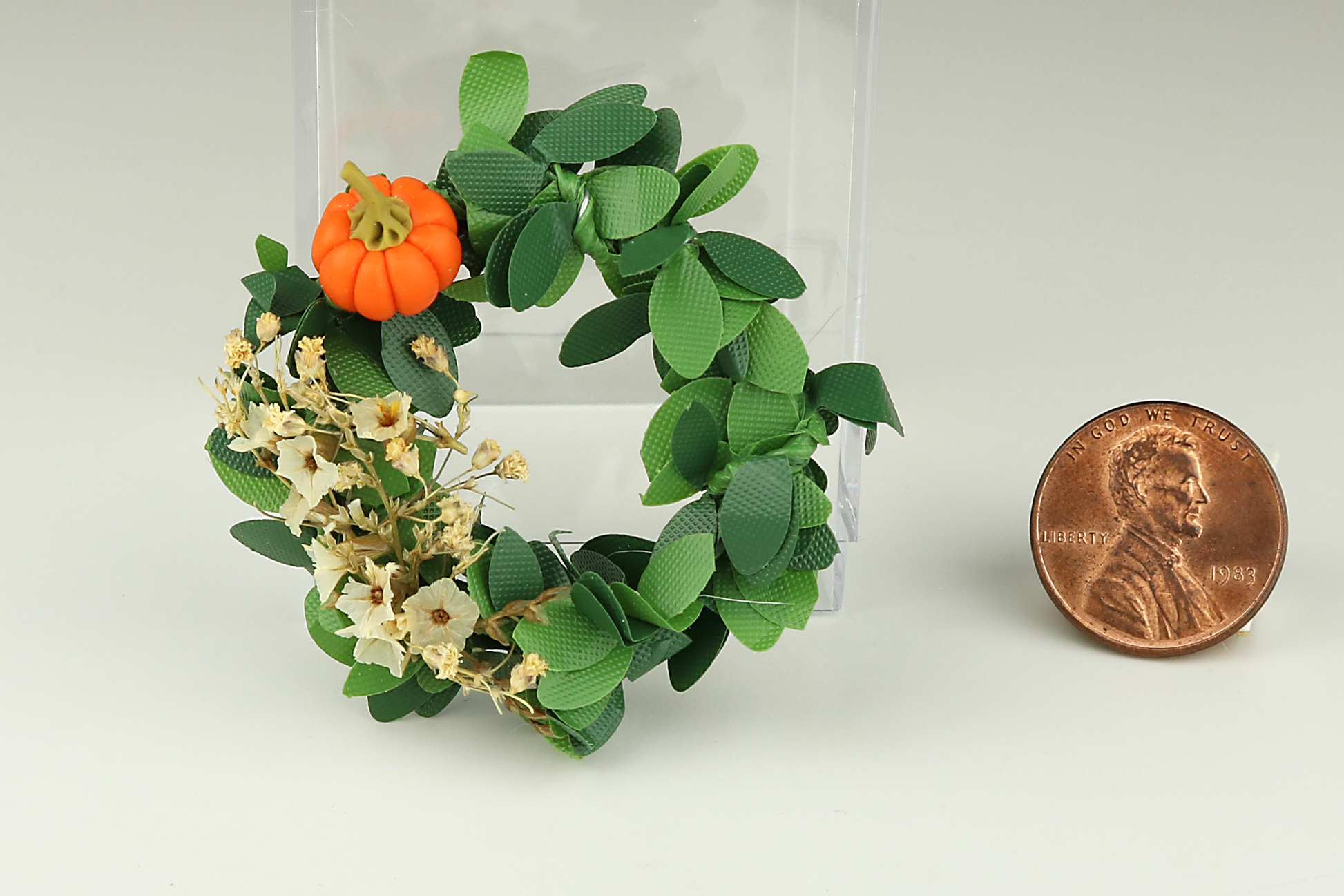 Welcome your guests this autumn with charm and whimsy. This delightful wreath features a tiny orange pumpkin and seasonally-appropriate dried flowers on a halo of green leaves.