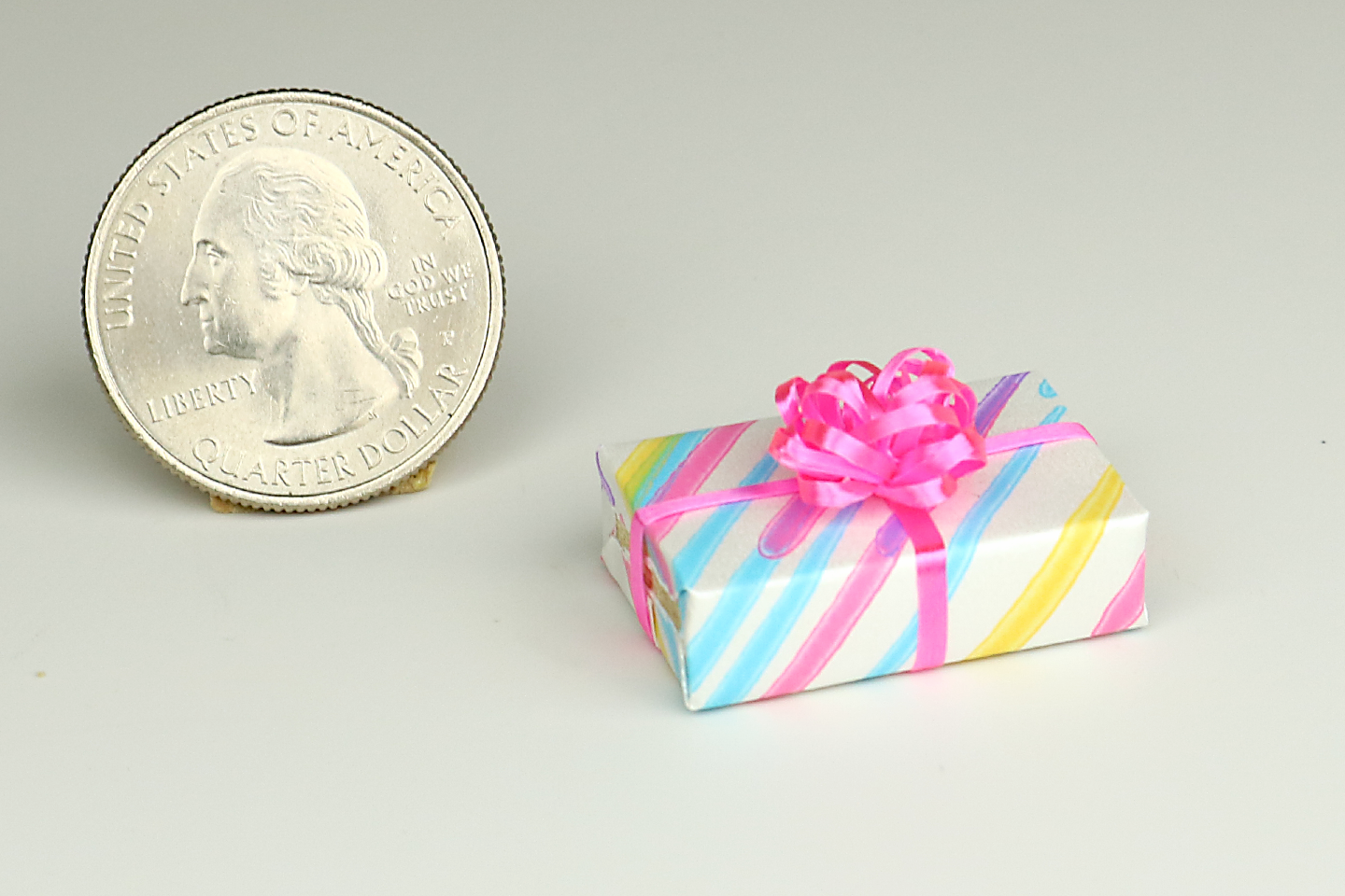 Gift them with pastel perfection with this tiny gift wrapped in pastel stripes of blue, pink, yellow and white, tied together with a pink ribbon and bow!