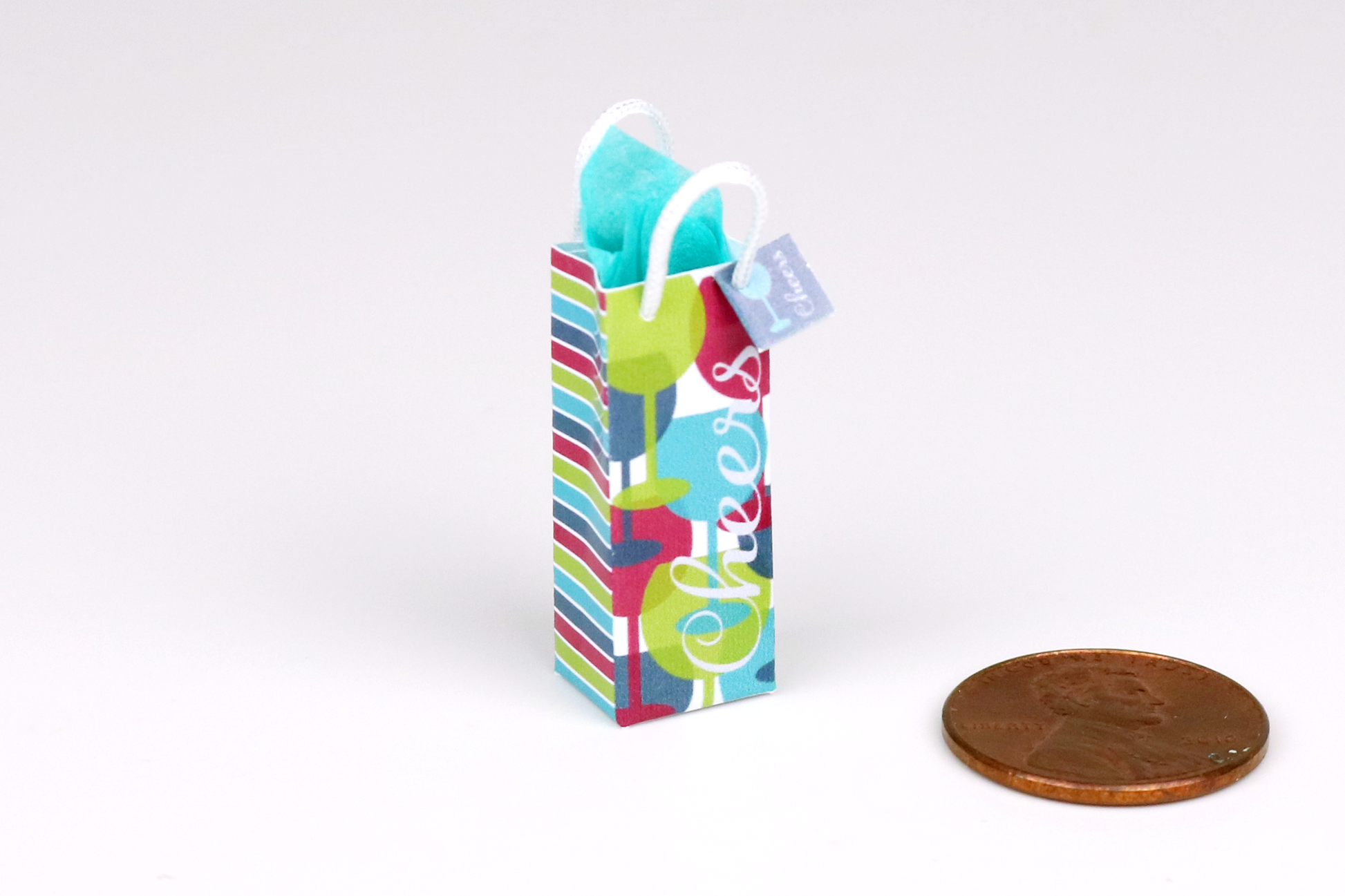 Gifting a teeny bottle of spirits has never been easier with this cheerful gift bag! There is a tiny, matching tag on the handle, and it is filled with precisely arranged coordinating tissue paper.