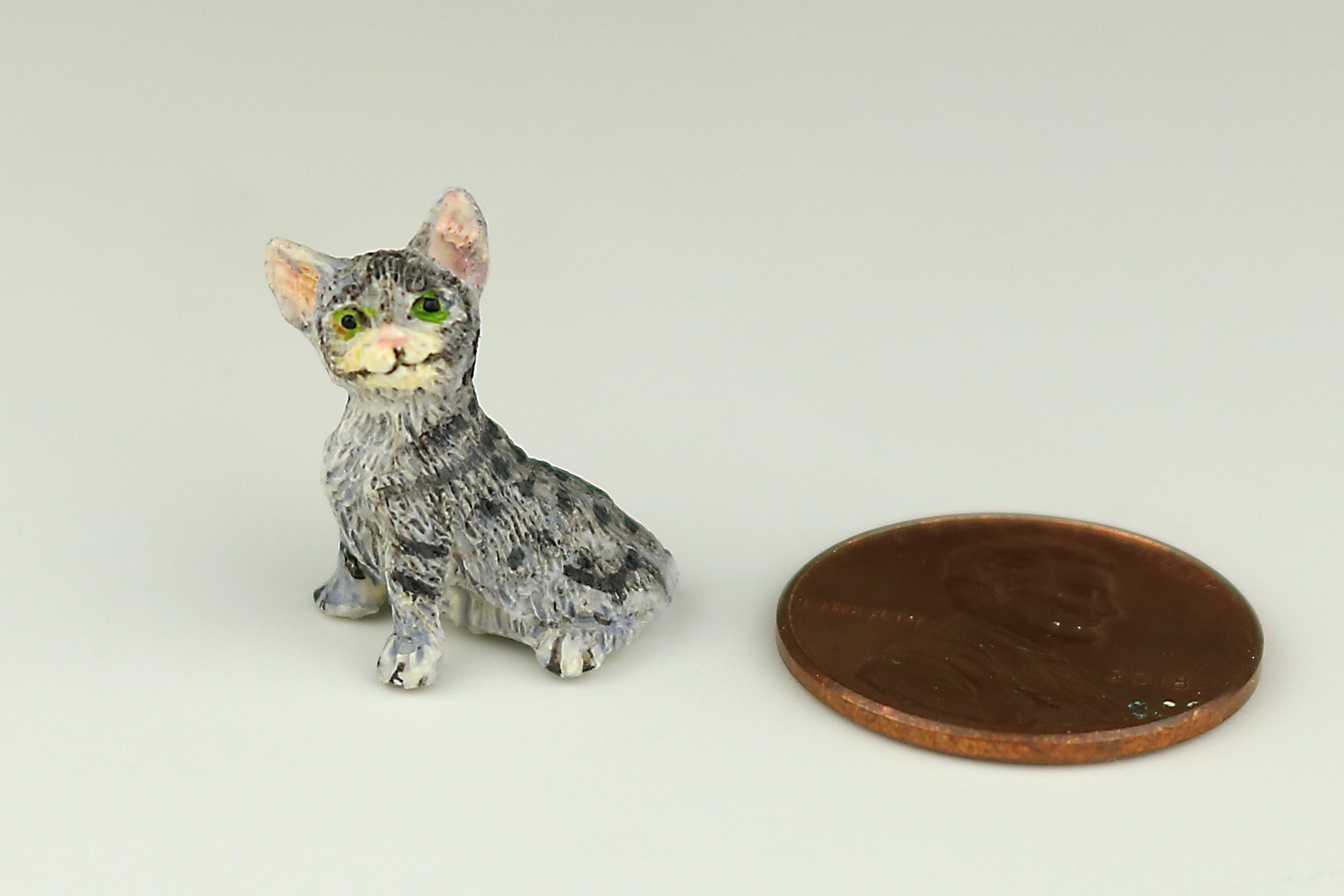 This happy gray tabby kitten is looking for a loving home in your dollhouse... adopt an adorable miniature pet today!