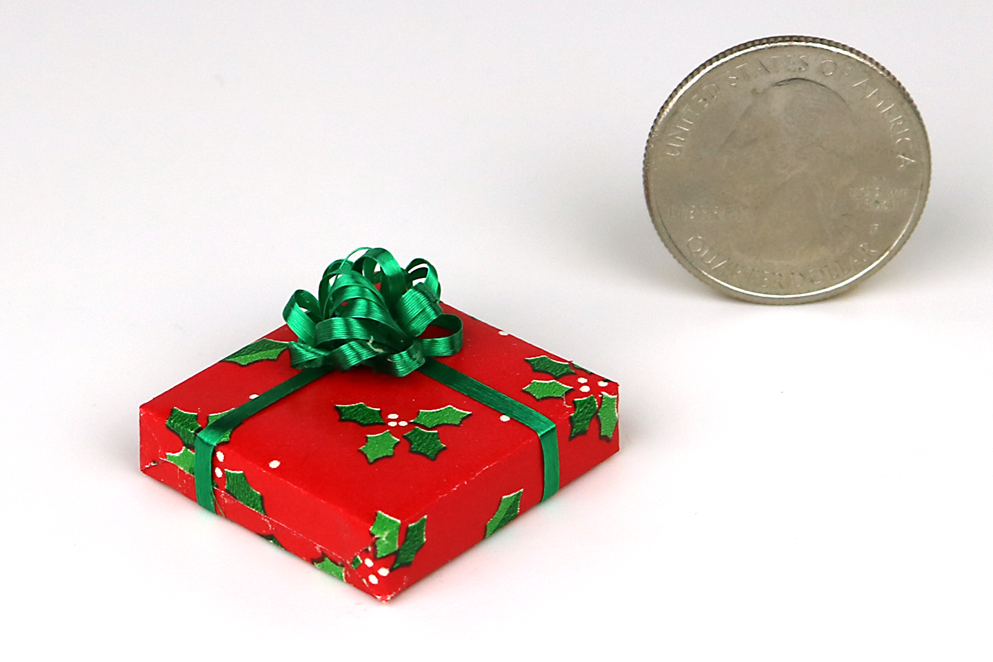 Share in the spirit of the holiday season with this tiny gift wrapped in holly-adorned paper with green ribbon and a matching bow!