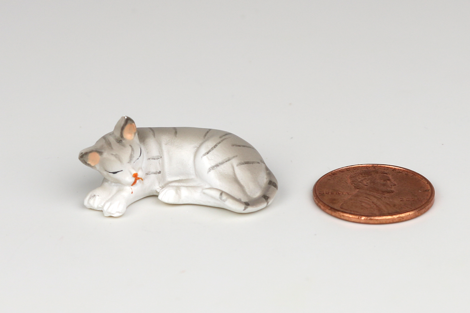 This sleeping tabby cat is ready to curl up at home on your miniature sofa... adopt an adorable miniature pet today!