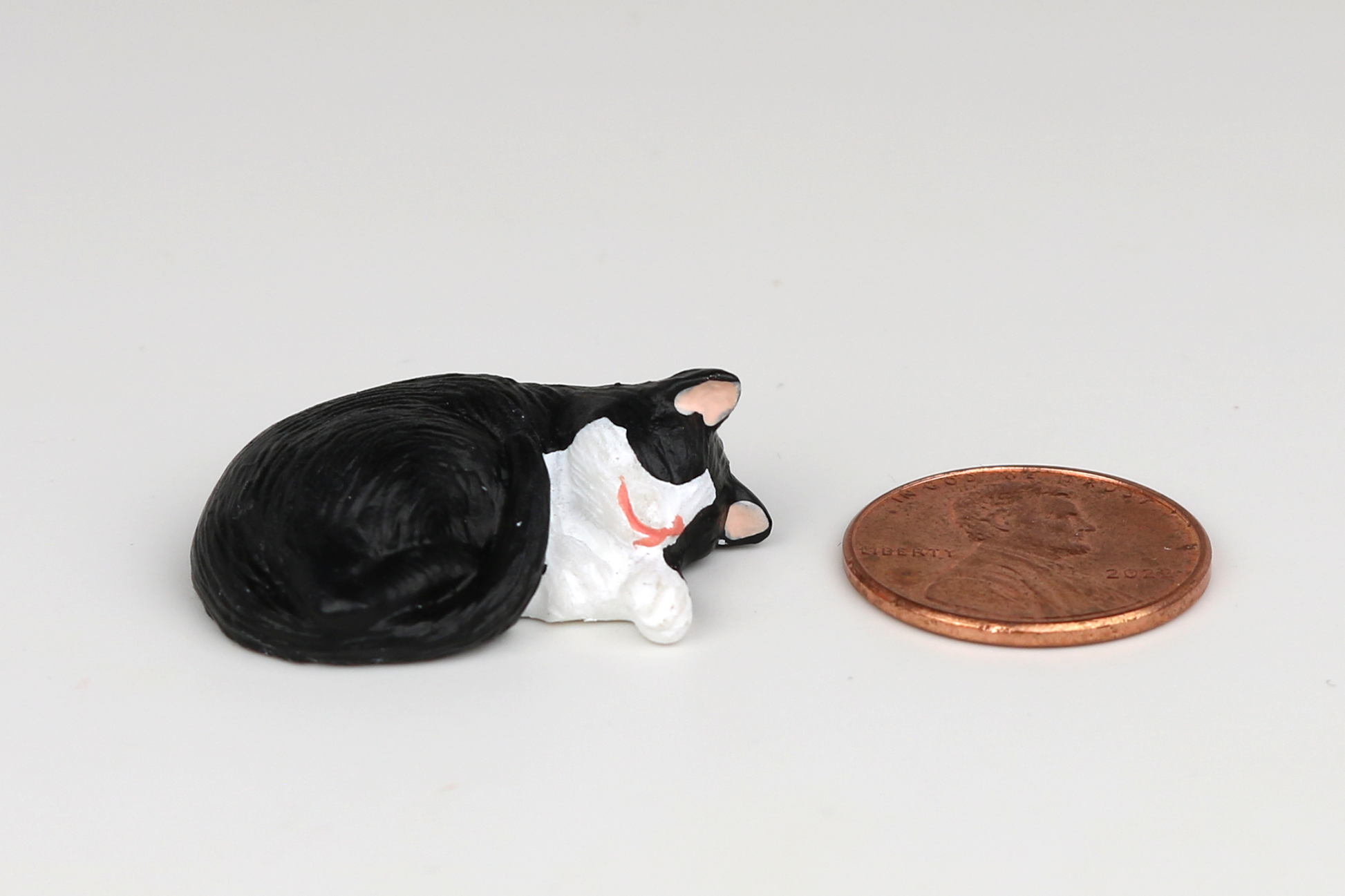 This sleeping tuxedo cat is ready to curl up at home on your miniature sofa... adopt an adorable miniature pet today!